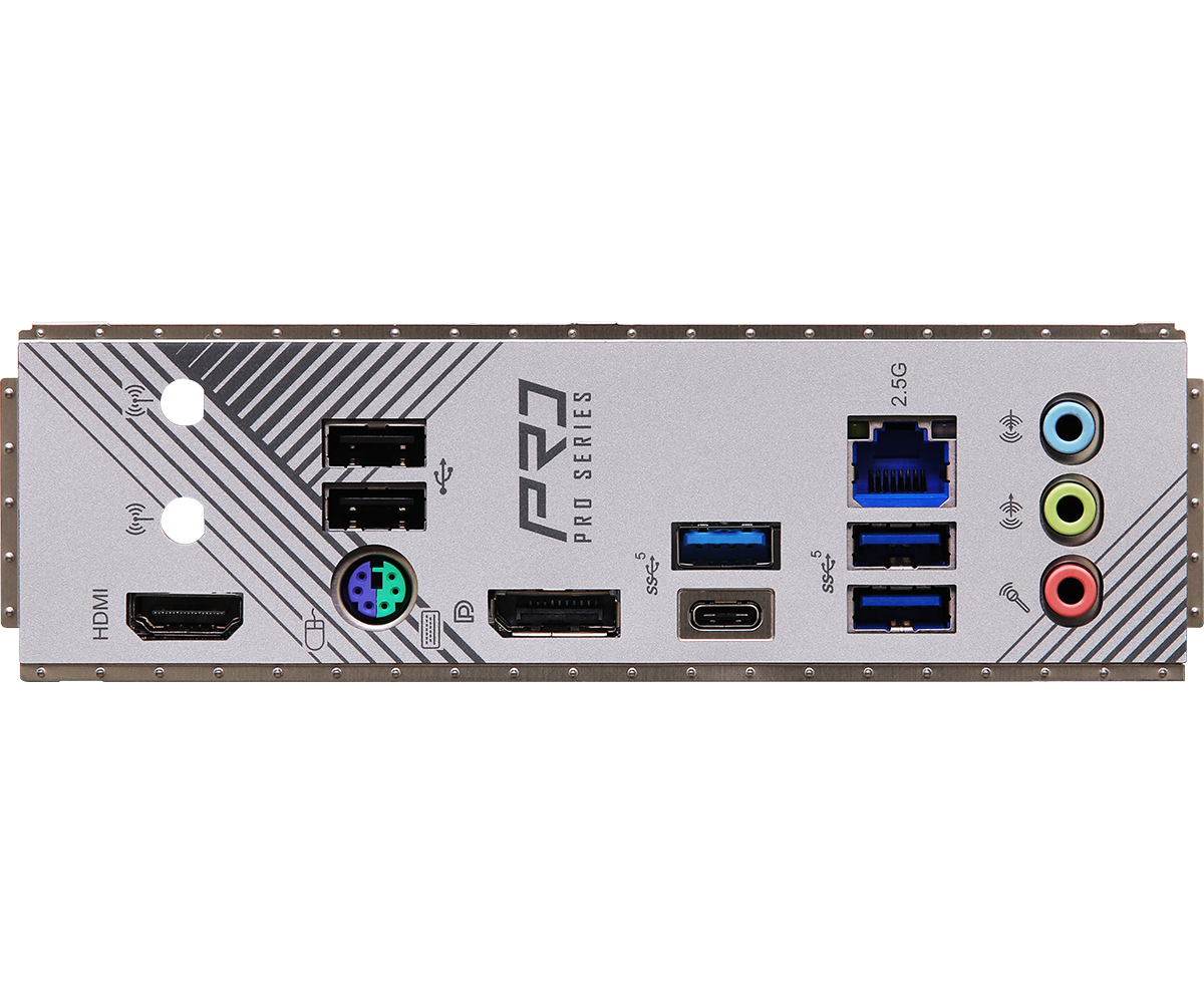 | Cổng kết nối phía sau | 2 x Antenna Mounting Points 1 x PS/2 Mouse/Keyboard Port 1 x HDMI Port 1 x DisplayPort 1.4 1 x USB 3.2 Gen1 Type-C Port 3 x USB 3.2 Gen1 Type-A Ports 2 x USB 2.0 Ports 1 x RJ-45 LAN Port 1 x HD Audio Jacks: Line in / Front Speaker / Microphone |