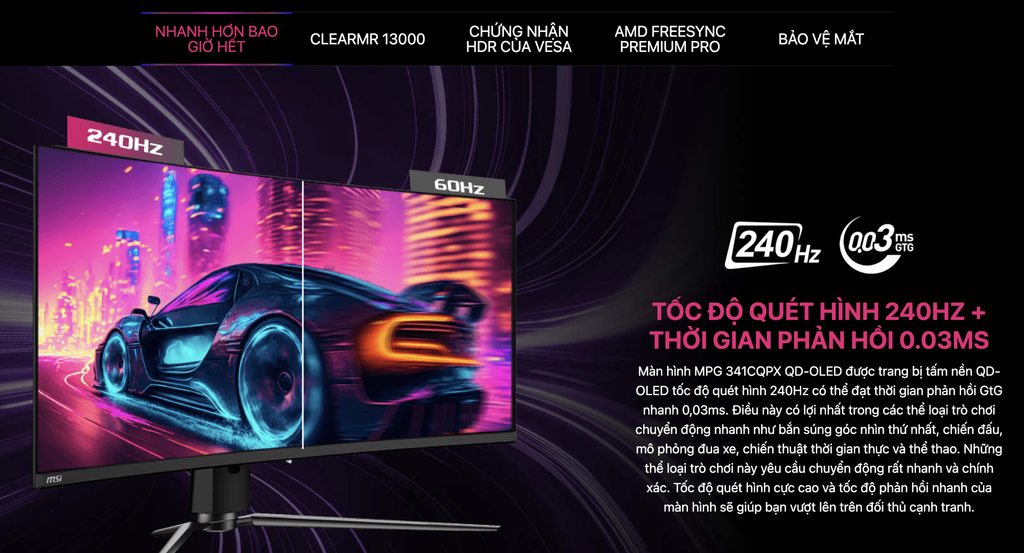 Hiệu năng chơi game xuất sắc: 240Hz kết hợp 0.03ms giúp loại bỏ hiện tượng giật, xé hình – cực kỳ thích hợp cho game eSports và hành động tốc độ cao.