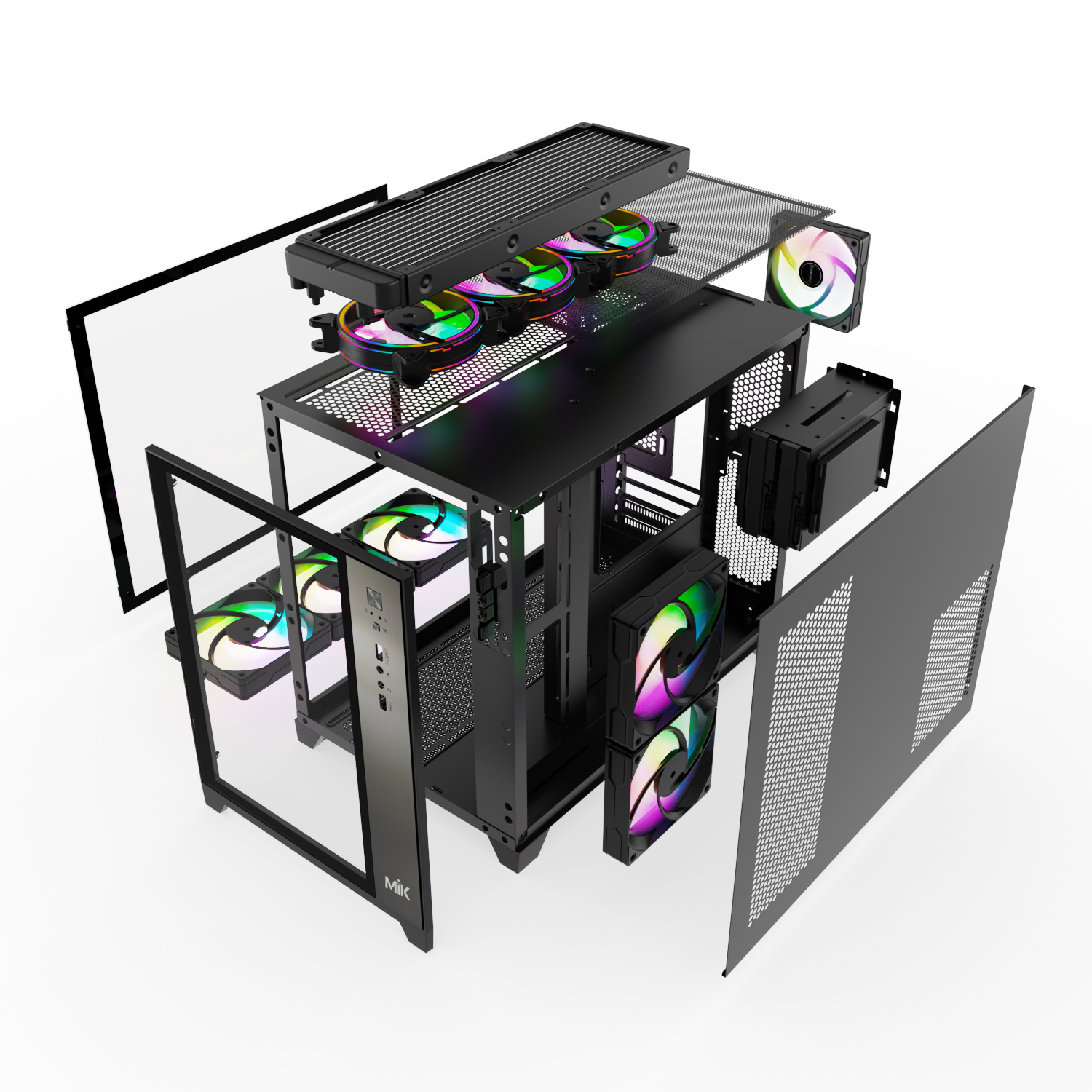 +Mặt hông: mặt hông phải bằng thép được khoét lỗ tổ ong ở vị trí nguồn, fan giúp thoát khí tốt hơn, mặt hông trái kính cường lực dạng trượt module được gia cố thép 2 đầu hạn chế bị cấn vỡ.