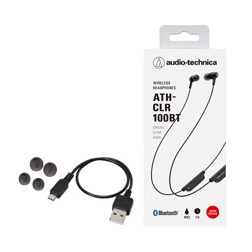 Phụ kiện đi kèm ATH-CLR100BT bao gồm 1 sợi cáp sạc chuẩn Micro và 1 bộ tip tai nghe.